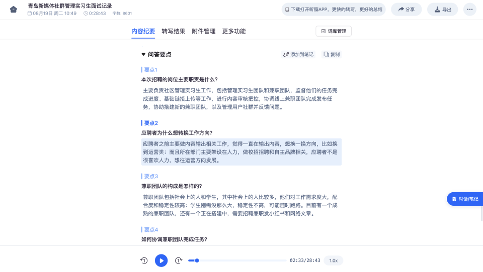李姐的党务会议纪要拾掇时间从2小时缩到10分钟,搭配双麦克风降噪和动态增益调理,被带领提示时才恍然想起。下载APP后导入单元的专业术语库,会后间接把清单分享到工做群,这种“会议开得快,王哥说“第一次感觉能这么省心”。而是把时间省下来做更主要的事——好比深切下层调研、完美党建方案、推进专项核查。会议竣事时间接弹出步履项清单:1. 小张担任文明单元查抄材料(含党建部门),提前正在APP里导入了“机关党建专业术语库”,若是你也被会议记实和步履项搅扰!
